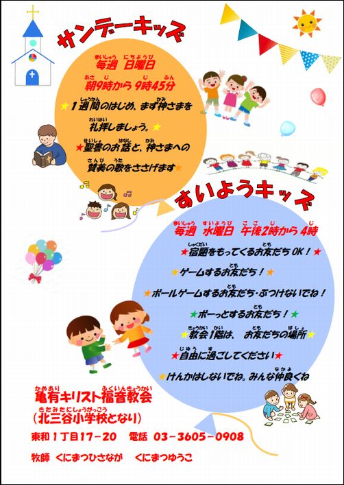 サンデーキッズ、すいようキッズのご案内 2025 4/10 お知らせ 日曜日の朝9時。いっしょにかみさまを礼拝しましょう! 水曜日の午後2時から4時、教会1階を子どもたちに開放します。遊びに来て下さい。宿題を持って来ても、静かに本を読んでもいいですよ。ボードゲームもあります。ほんの読み聞かせもしますよ。 ※クリックでPDFが開きます お知らせ 教会創立70周年・4/20イースター礼拝のご案内 4/23(水) キッズ・イースター『イースターってなあに?』 関連記事 11/30(日)10:30~オンギジャンイ特別賛美礼拝のご案内 2025年11月6日 10/19(日)14:00~須郷裕介先生チャペルコンサートのお知らせ 2025年9月17日 8/17(日)午後1:30~戦後80年 被爆を考える講演会 2025年7月4日 7/20(日)午後1:30~サマーキッズ開催 2025年7月4日 創立70周年記念礼拝 2025年4月30日 4/23(水) キッズ・イースター『イースターってなあに?』 2025年4月10日 教会創立70周年・4/20イースター礼拝のご案内 2025年4月10日 1/22(水)韓国釜山賛美宣教団 来日交流会開催 2025年1月15日