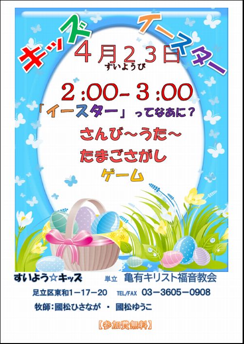 4/23(水) キッズ・イースター『イースターってなあに?』 2025 4/10 お知らせ 『イースターってなあに?』皆さん、ごぞんじですか?子どものために4月23日水曜日午後2時からイースタースペシャルを行います♪ゲームやエッグハントそして『イースターってなあに?』お教えします。どなたでも是非、お越しください。 お知らせ サンデーキッズ、すいようキッズのご案内 創立70周年記念礼拝 関連記事 11/30(日)10:30~オンギジャンイ特別賛美礼拝のご案内 2025年11月6日 10/19(日)14:00~須郷裕介先生チャペルコンサートのお知らせ 2025年9月17日 8/17(日)午後1:30~戦後80年 被爆を考える講演会 2025年7月4日 7/20(日)午後1:30~サマーキッズ開催 2025年7月4日 創立70周年記念礼拝 2025年4月30日 サンデーキッズ、すいようキッズのご案内 2025年4月10日 教会創立70周年・4/20イースター礼拝のご案内 2025年4月10日 1/22(水)韓国釜山賛美宣教団 来日交流会開催 2025年1月15日